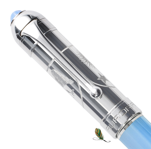 Significantly stands out among all its components is its impressive cap made, like the other ornamental elements, in solid 925 thousandths silver. Its delicate silhouette aims to schematically emulate the shapes of the papal tiara and is crowned, on the head, with a semi-precious sky blue stone in clear reference to the flag of Argentina, the Pope's native land, a tribute that is repeated in the Beautiful body of the pen, made of marbled resin of the same shade.